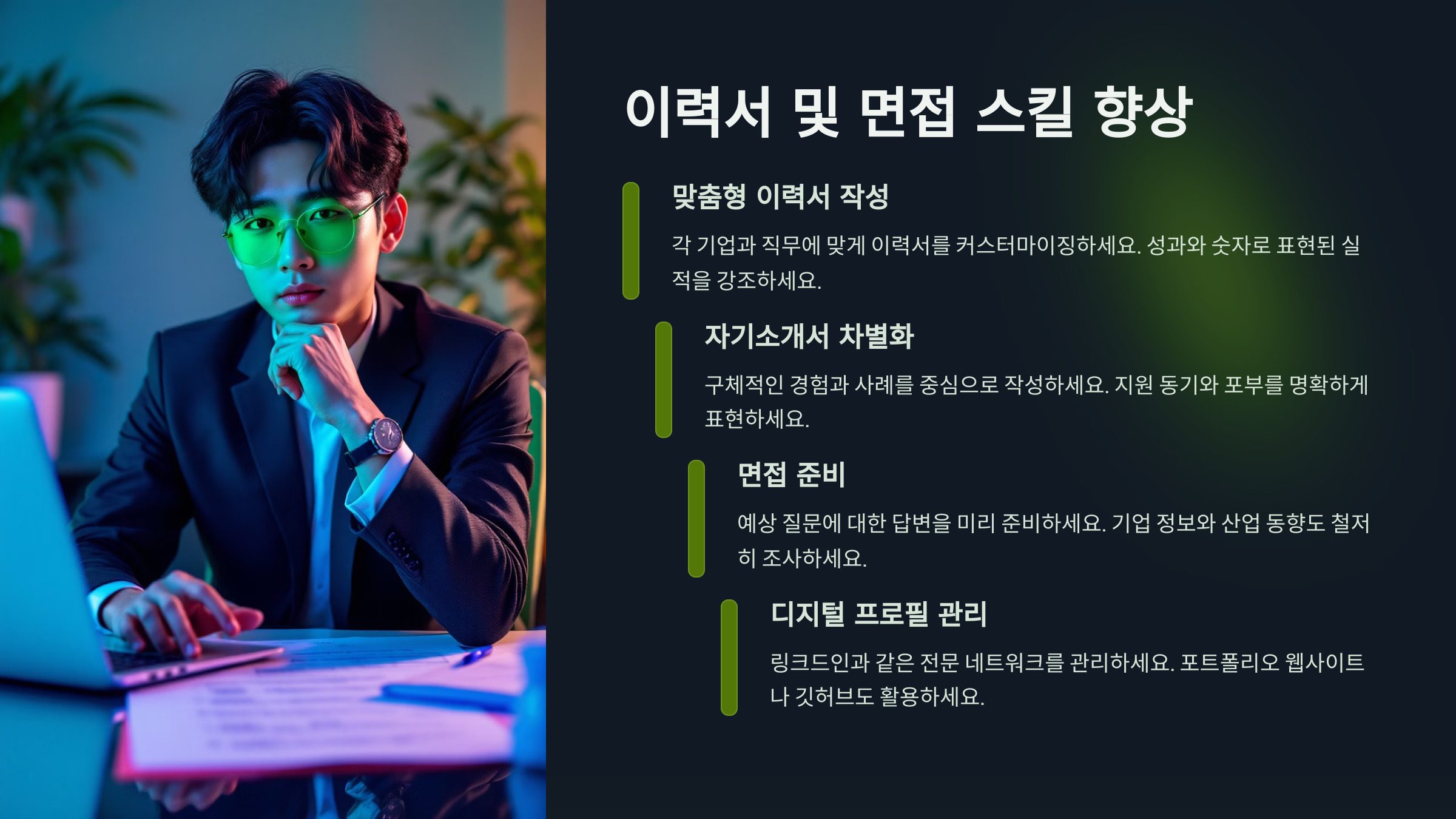 이력서를 작성할 때는 자신의 경험과 강점을 효과적으로 정리하는 것이 중요하고, 면접에서는 질문에 논리적으로 답변하면서 자신감을 보여주는 것이 핵심이에요. ✨
