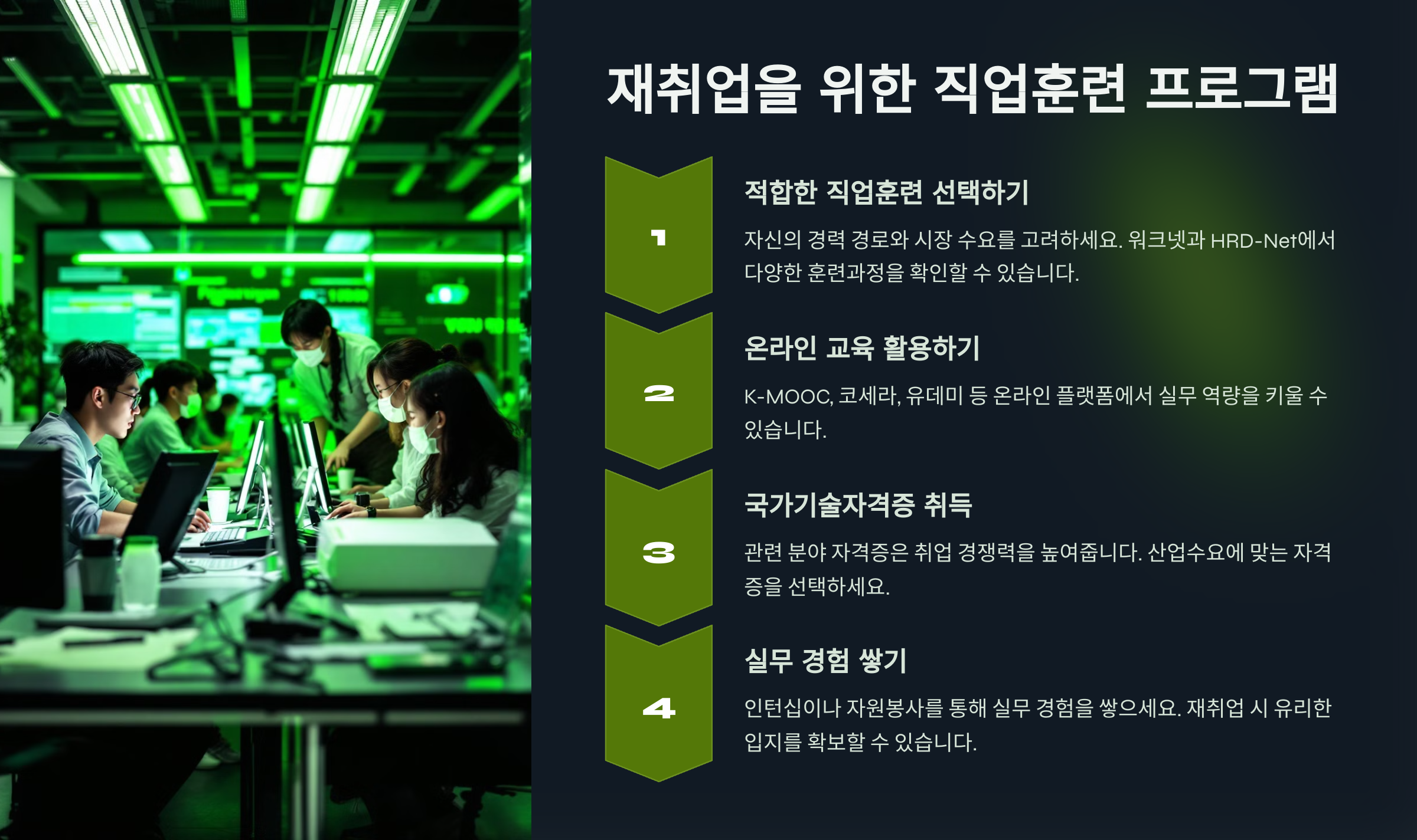 재취업을 위해서는 새로운 기술을 배우거나 기존 경력을 업그레이드하는 것이 중요해요. 다행히도 정부와 민간에서 제공하는 다양한 직업훈련 프로그램이 있어서 실업자들이 쉽게 배울 수 있답니다. 📚