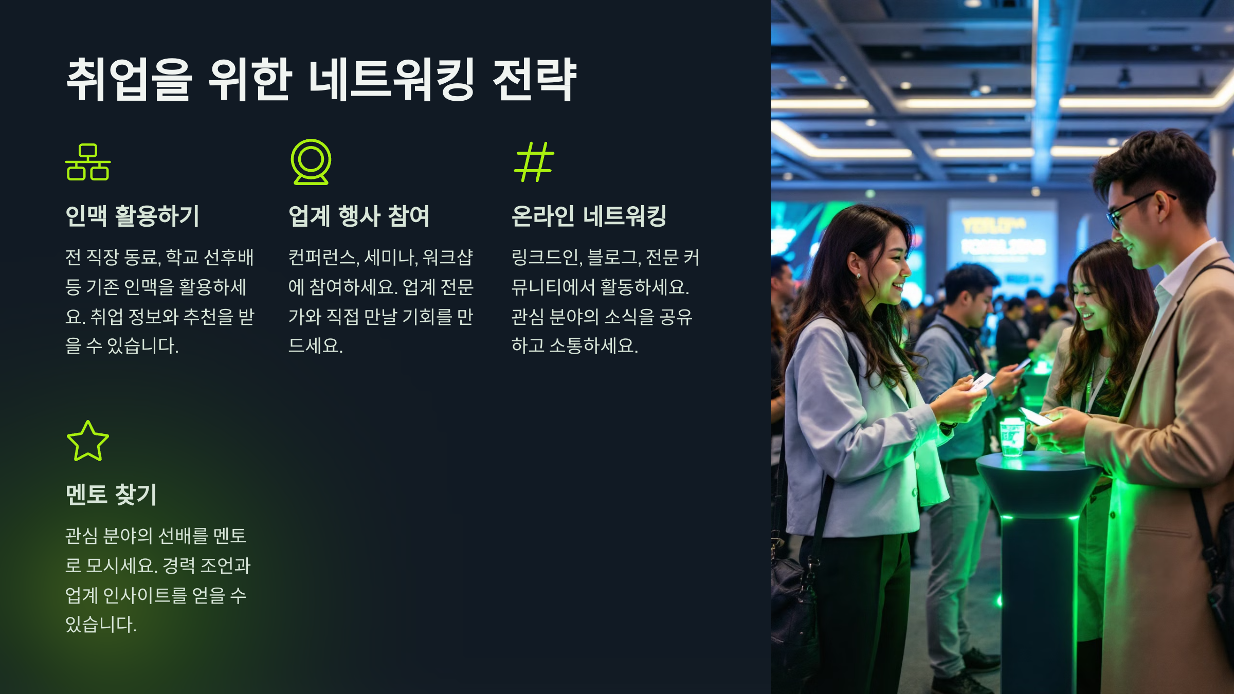 | 오프라인 네트워킹 | 업계 세미나, 취업 박람회, 동문회 참석 |
